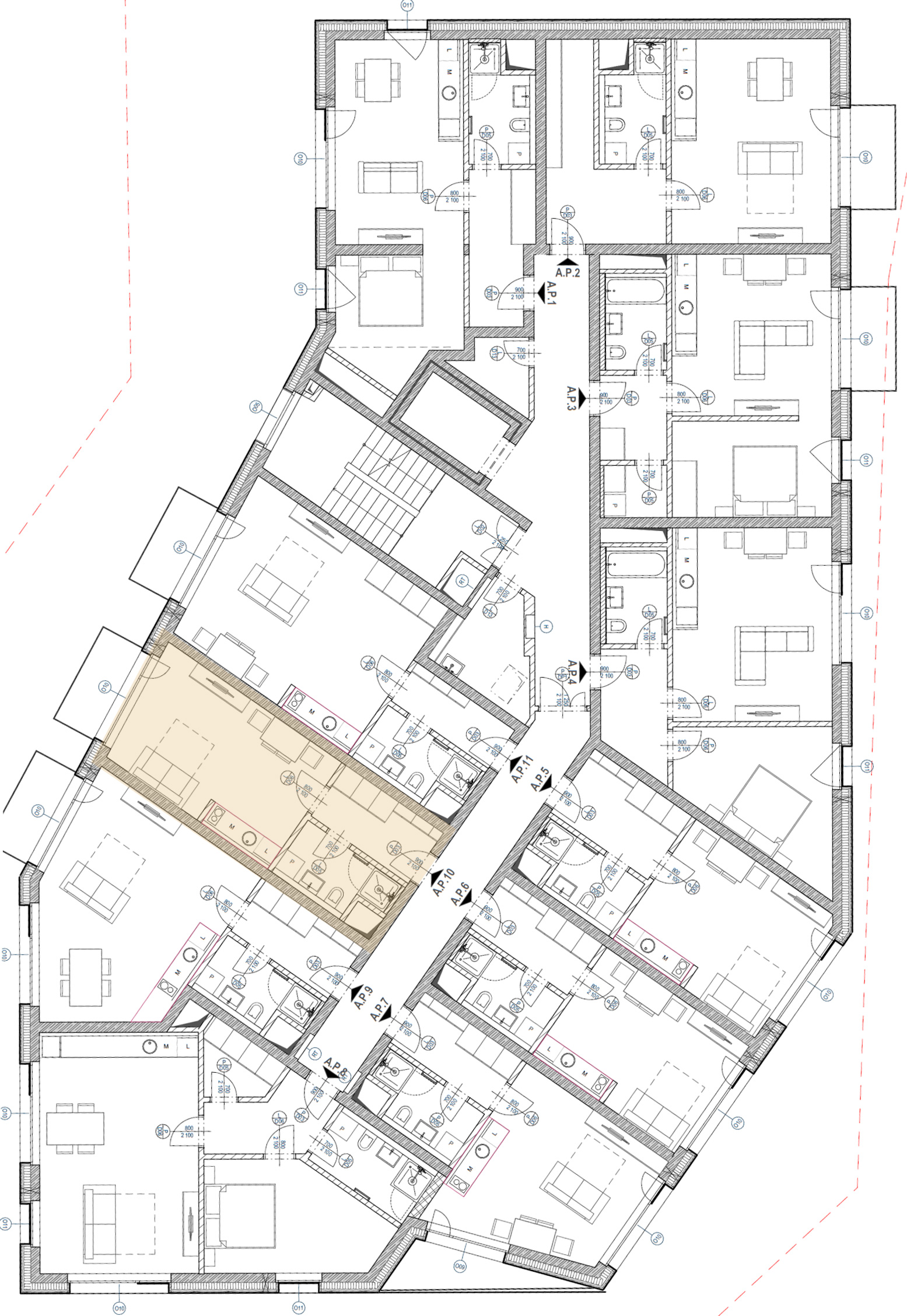 Dispoziční řešení 1+kk je navrženo s důrazem na efektivní využití prostoru, dostatek úložných kapacit a pohodlné zázemí jak pro vlastní pobyty, tak pro profesionální provoz ubytovacích služeb. Apartmán bude předán kompletně vybavený nábytkem a interiérovými prvky určenými pro hotelový provoz ve vysokém standardu 4–5.