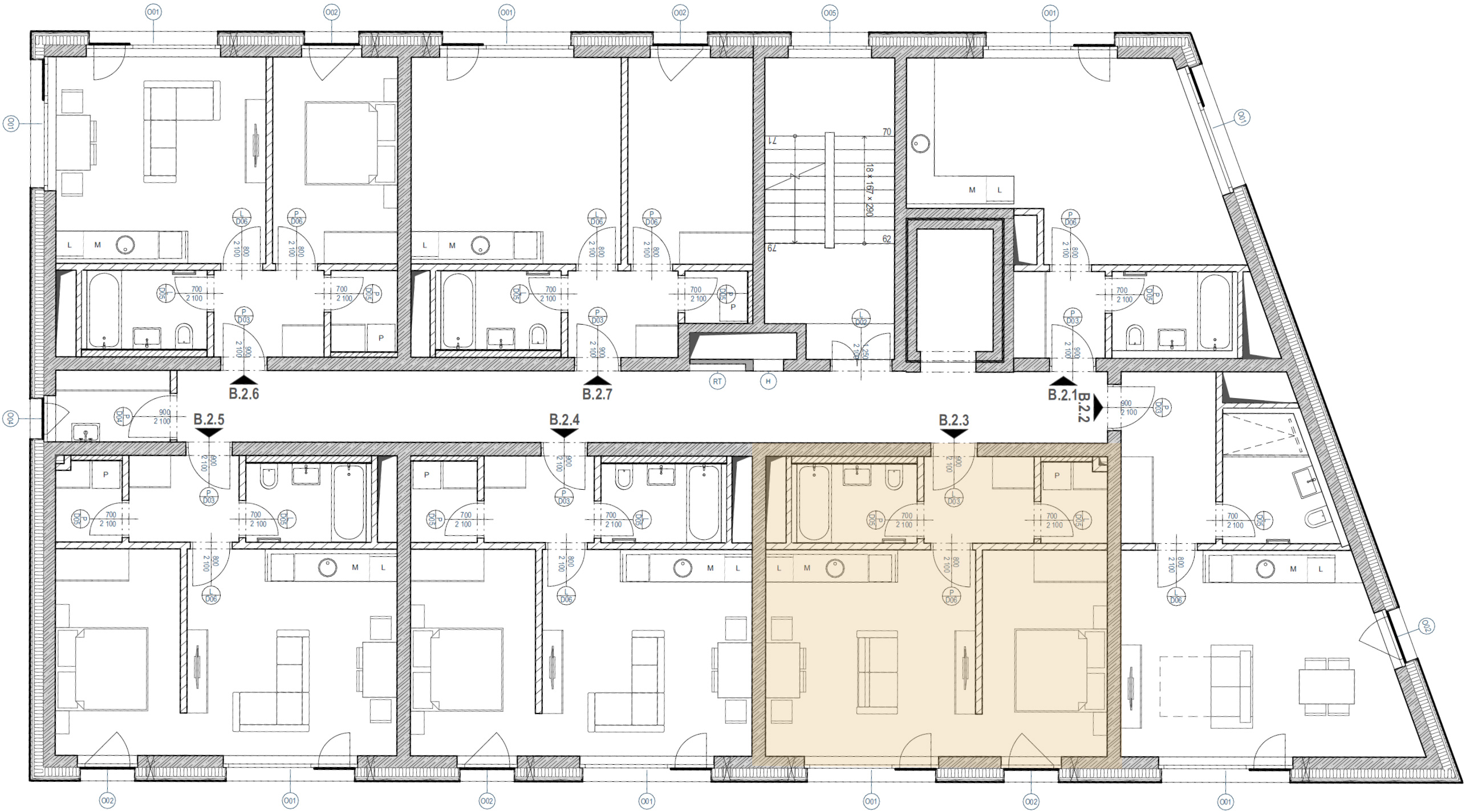 Apartmán disponuje jižní orientací oken, která zajišťuje dostatek denního světla a přirozený kontakt s okolním prostředím rezidence a horskou krajinou. Dispozice je navržena s důrazem na praktické členění prostoru, efektivní využití podlahové plochy a dostatek úložných kapacit, což odpovídá nárokům moderního horského apartmánu.