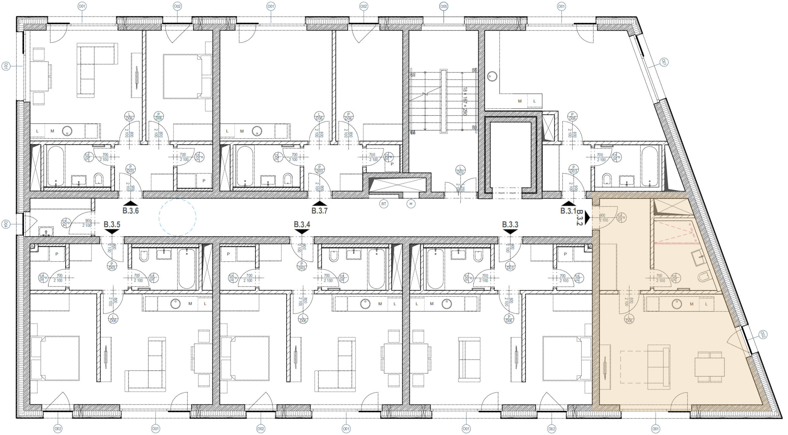 Apartmán disponuje východní a jižní orientací oken, která zajišťuje dostatek denního světla a přirozený kontakt s okolním prostředím rezidence a horskou krajinou. Dispozice je navržena s důrazem na praktické členění prostoru, efektivní využití podlahové plochy a dostatek úložných kapacit, což odpovídá nárokům moderního horského apartmánu.