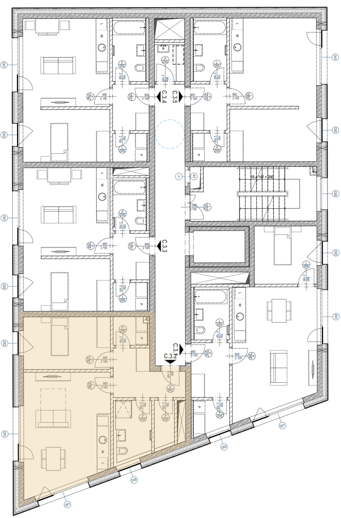 Budova C mírně ustupuje od hlavní uliční fronty rezidenčního souboru, čímž přirozeně vytváří menší veřejné prostranství a opticky odlehčuje centrální část areálu. Oproti sousedním budovám B a D působí štíhlejším dojmem, což se promítá do komornějšího měřítka domu a klidnějšího rezidenčního charakteru.