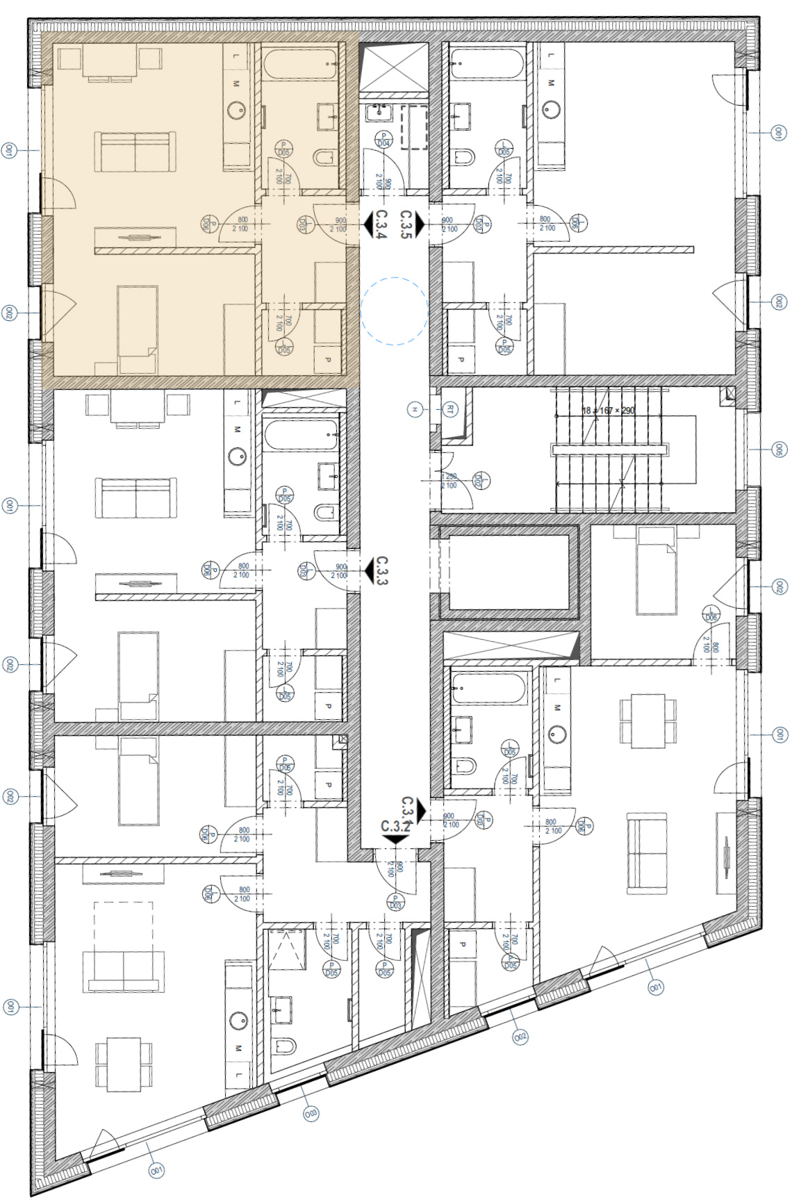 Budova C mírně ustupuje od hlavní uliční fronty rezidenčního souboru, čímž přirozeně vytváří menší veřejné prostranství a opticky odlehčuje centrální část areálu. Oproti sousedním budovám B a D působí štíhlejším dojmem, což se promítá do komornějšího měřítka domu a klidnějšího rezidenčního charakteru.