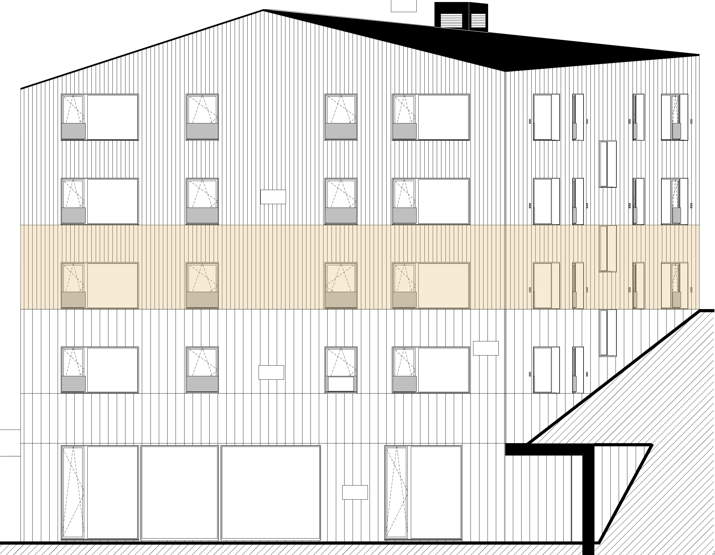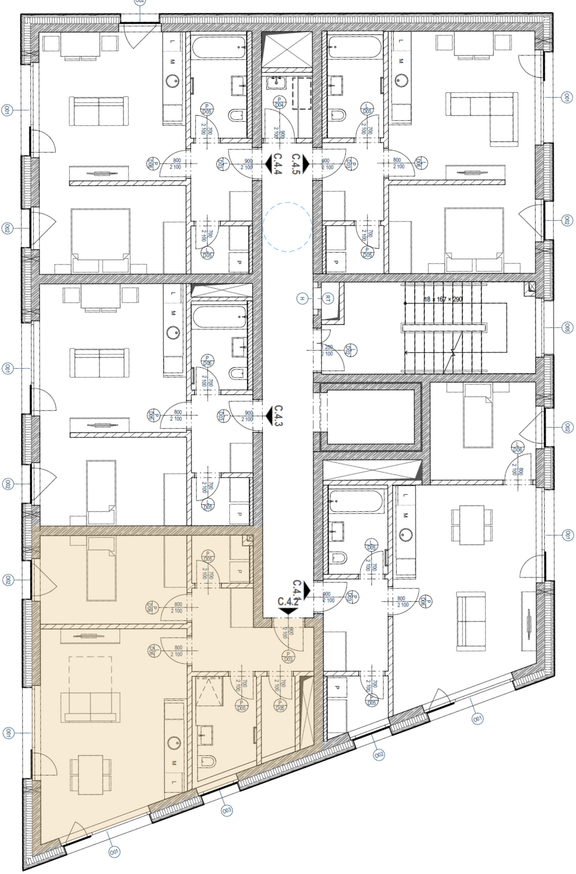 Budova C mírně ustupuje od hlavní uliční fronty rezidenčního souboru, čímž přirozeně vytváří menší veřejné prostranství a opticky odlehčuje centrální část areálu. Oproti sousedním budovám B a D působí štíhlejším dojmem, což se promítá do komornějšího měřítka domu a klidnějšího rezidenčního charakteru.