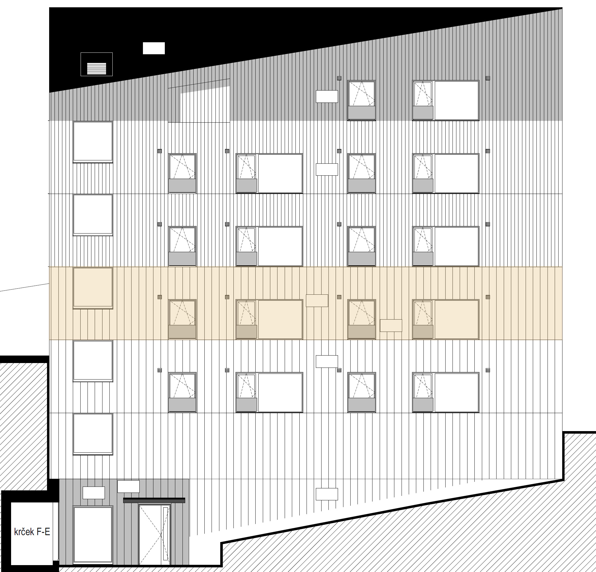 Budova F je situována ve druhé linii od hlavní komunikace, ve svahu nad